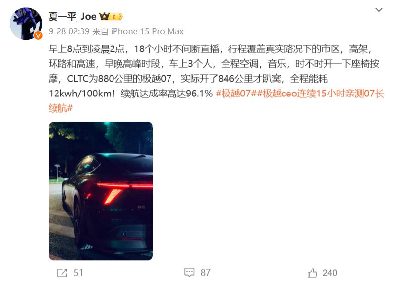 9月底,夏一平亲自上阵,在真实路况下进行了极限07电池寿命直播。从出发到完全“躺下”车辆,整个直播持续了18个小时,打破了汽车公司CEO持续直播的时长记录。