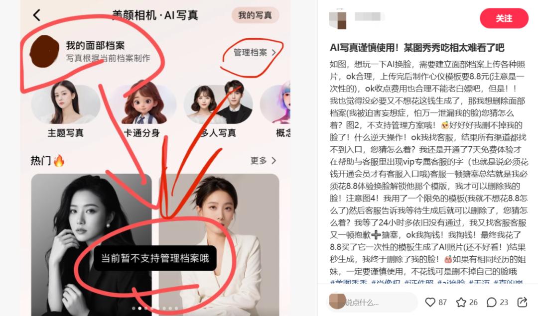 也有不少用户提到,美图秀秀不充会员就不能管理面部档案,“连自己的个人信息都不能做主,想删除也不行。”