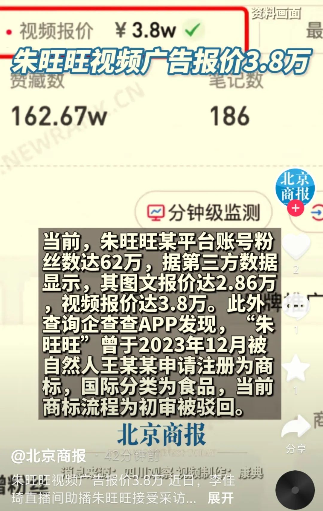 据了解,朱旺旺也在运营自媒体账号。目前,她在某平台上的粉丝数量已达62万。根据第三方数据,其图文价格达到2.86万,视频价格达到3.8万。