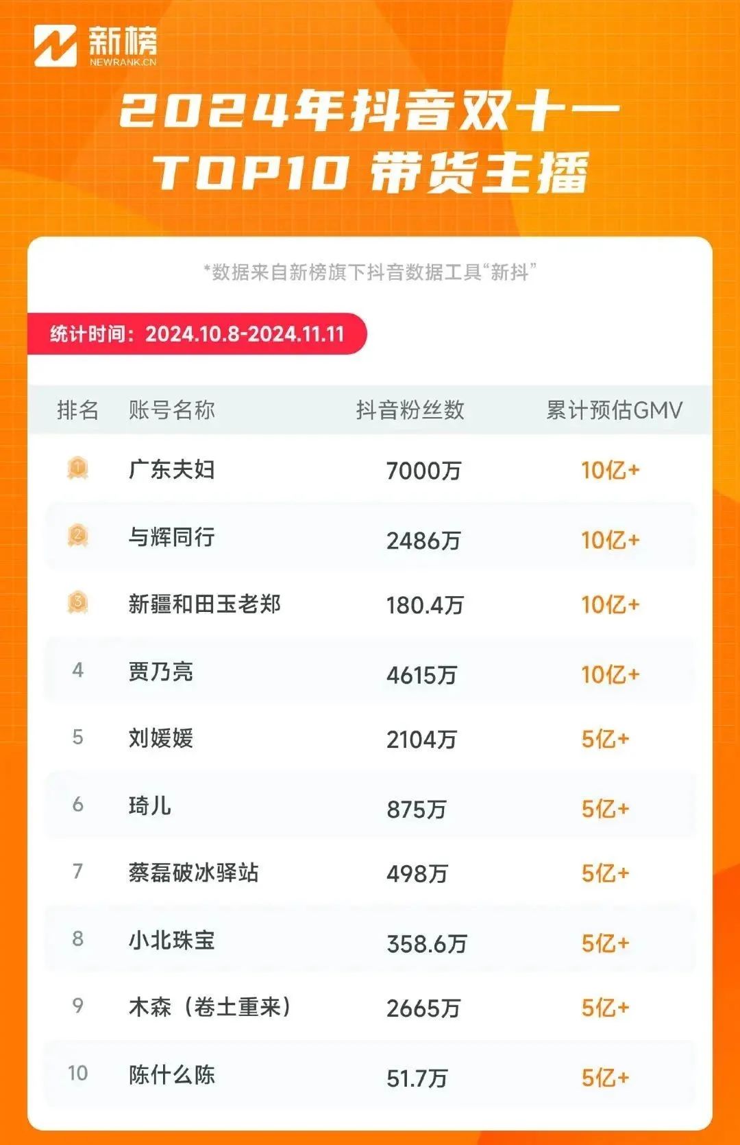 今年的双11也没有黑马。 ,广东夫妇,与辉同行占据榜单前列。