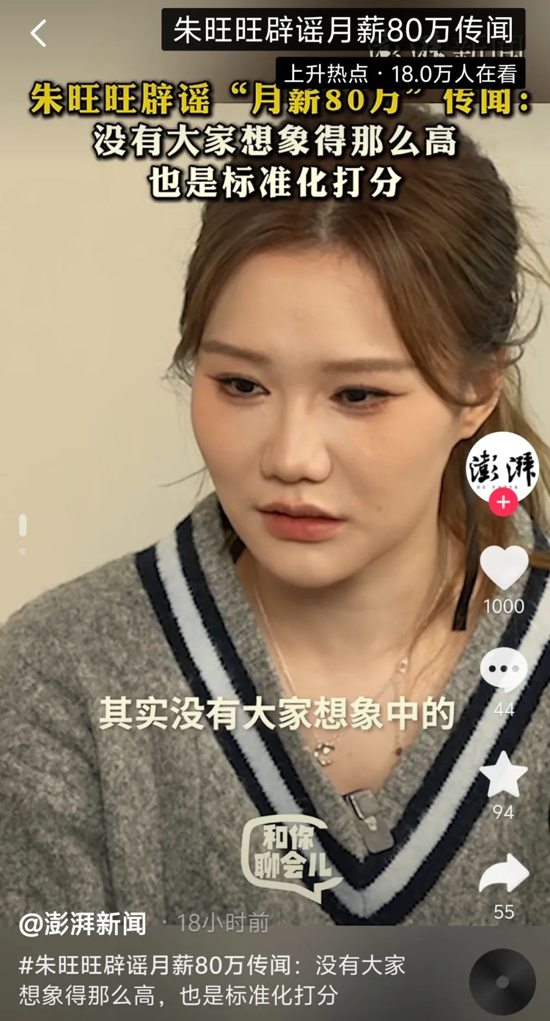 朱旺旺说:“我可以辟谣,没有大家想象的那么高。客观来说,我还是公司的员工,所以是正常的工资和业绩,我们会有非常标准化的分数。有时候工资会被妖魔化,有点夸张。”