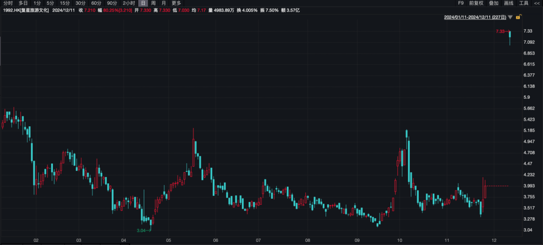 复星旅游文化复牌后,12月11日大幅上涨80.25%。