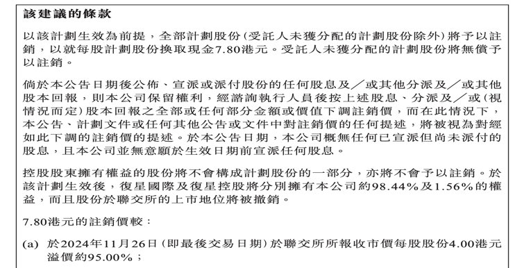 复星旅游文化集团近日发布公告称,公司将进行私有化,每股计划换取现金7.80港元,与2024年11月26日相比,注销价格的溢价约为95%。