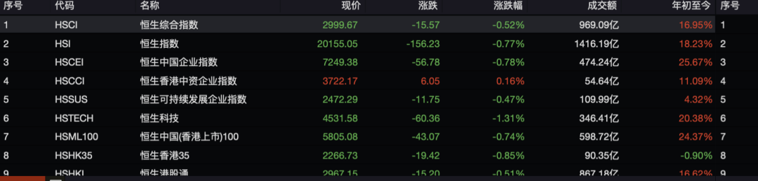 恒生业指数涨跌不一。必需消费增长1.13%,原材料增长0.99%,公共事业增长0.79%。;非必需消费的下降幅度居前。