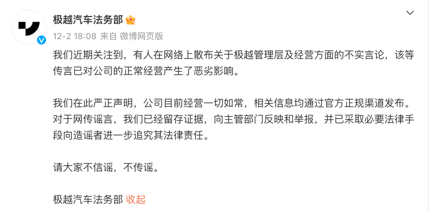 此外,极越汽车法务部还通过微博发文称,有人在网上散布关于极越管理和运营的虚假言论,传闻对公司的正常运营产生了不利影响。现在企业经营一切如常,相关信息都是通过官方正规平台发布的。对网络谣言,公司已保留证据,向主管部门反映和举报,并采取必要的法律手段,进一步追究造谣者的法律责任。请不要相信谣言,不要传谣。