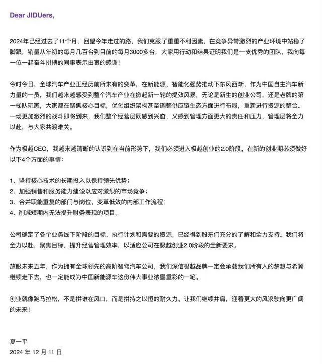 夏一平在内部信中表示,极越必须进入创业2.0阶段,做好四件事,包括长期坚持核心技术投入,保持领先优势;加强营销和服务能力建设,应对激烈的市场竞争;合并重复部门和岗位的责任,改变低效的内部工作流程,减少短期内无法提高财务业绩的项目。