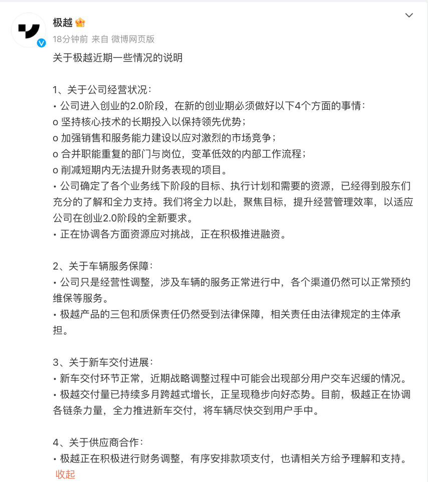 在供应商合作方面, 极越正在积极进行财务调整,有序安排支付款项,也请有关方面给予理解和支持。