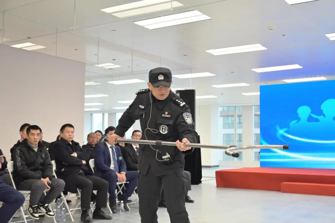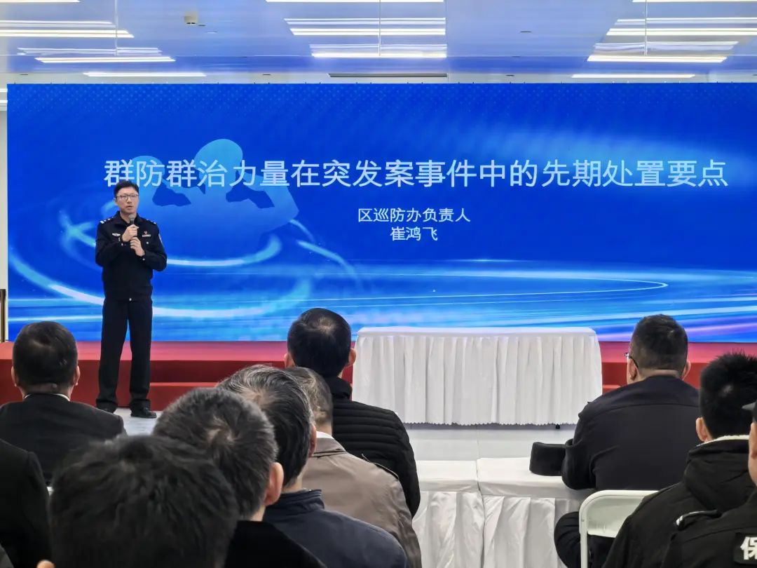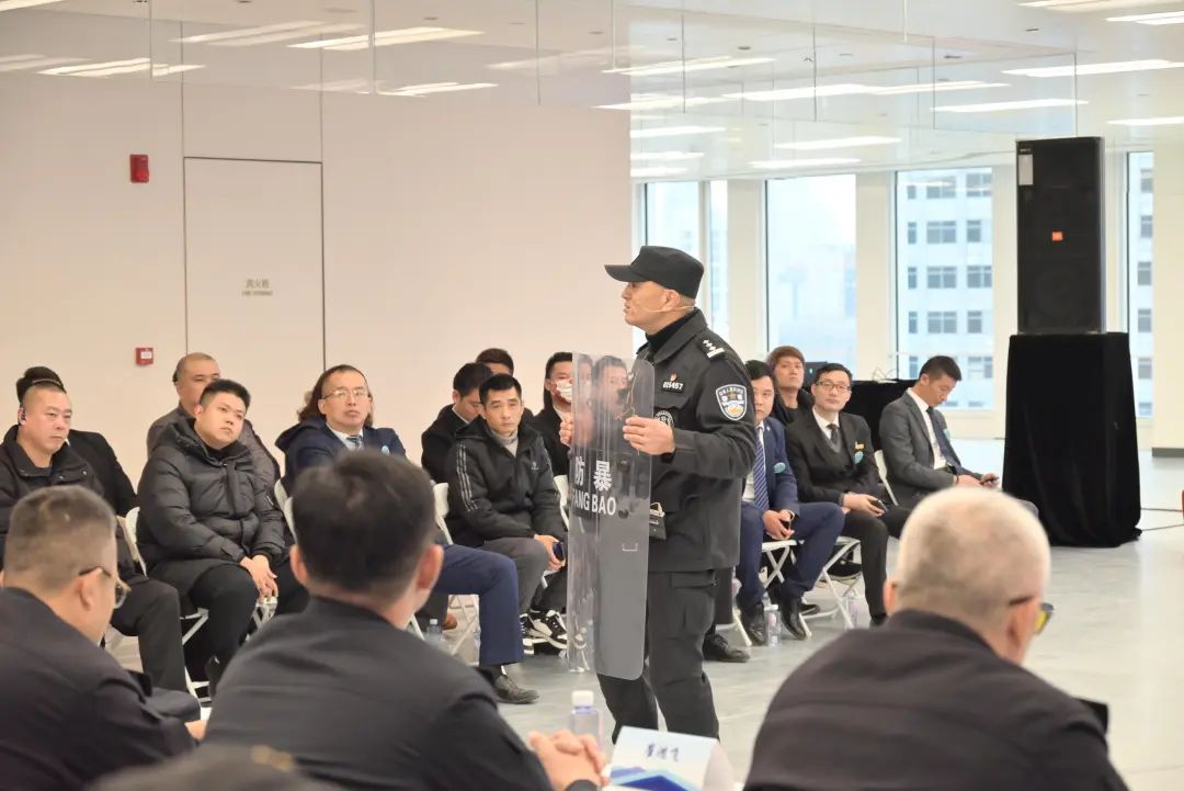 紧急情况见效快,等待专业力量到场处理通常会错过最佳战斗机。区巡逻办公室负责人崔鸿飞结合演练场景,详细讲解了《突发事件中群防群治力量的早期处置要点》,明确了物业保安、清洁等社会力量在突发事件初期应采取的有效措施。黄浦区公安局特警支队教官戴增辉向大家展示了防暴盾、防暴钢叉等设备的标准使用方法,确保每个参与者都能熟练掌握这些工具的应用技巧。