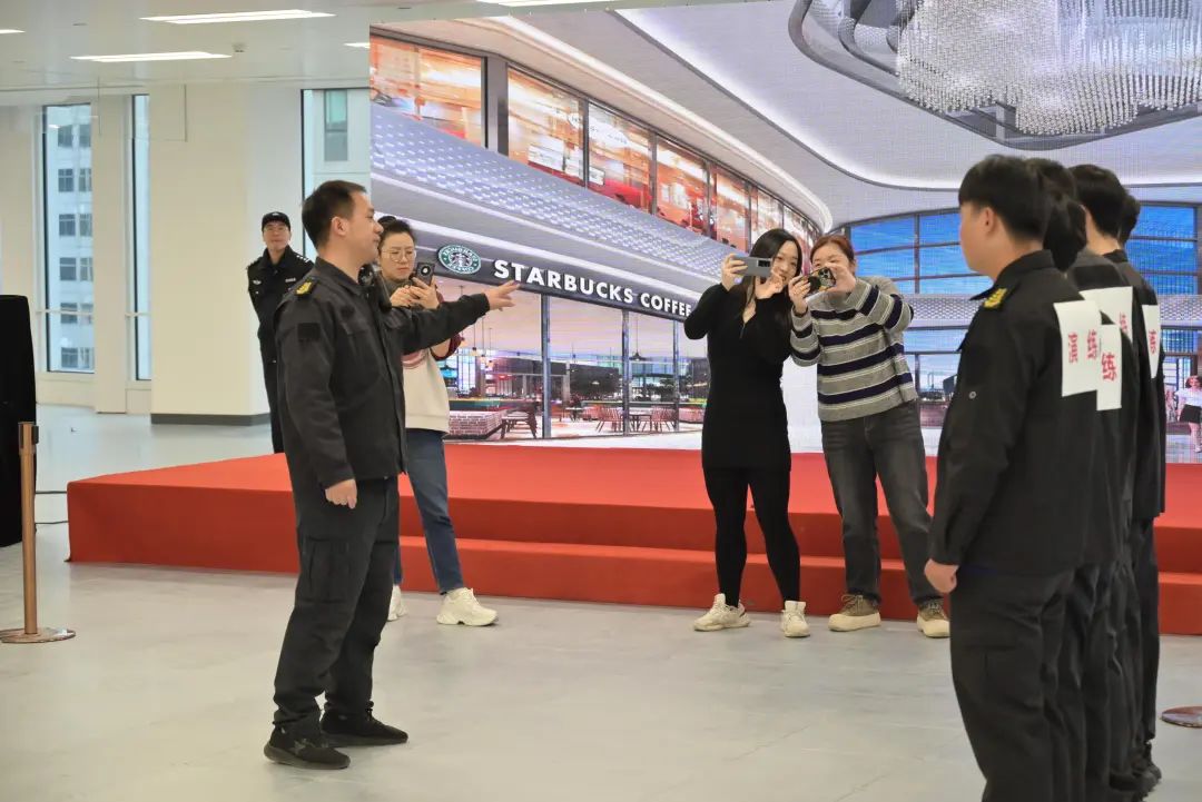在情景模拟中,王某因为消费纠纷找不到解决方案而情绪激动,最终变成了持刀伤人事件。面对意外情况,商场保安迅速反应,立即向队长汇报。队长打电话给三名队员,带着防爆盾叉到场。三名保安拉开警戒线,疏散了围观者,并通过广播给警方打电话支持他们。不到三分钟,持刀人就被保安用巨盾成功控制,然后由在场的警察带走。