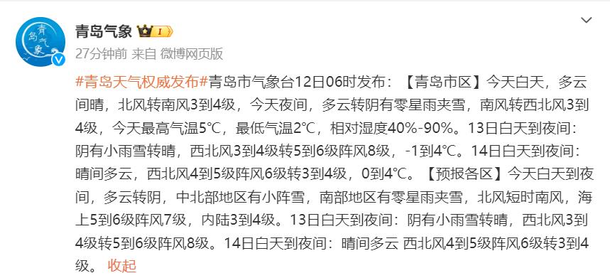 【青岛城区】今天白天多云晴天,北风向南风转3-4级。今天晚上,多云有零星雨夹雪,南风向西北风转3-4级。今天最高温度为5℃,最低温度为2℃,相对湿度为40%-90%。