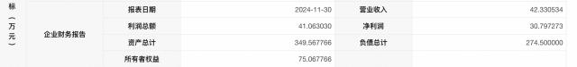 据 2024-11-30 财务报告显示,目标企业的营业收入 42.33 一万元,净利润 30.8 资产总额为万元 349.57 一万元,债务总额为 274.5 万元。