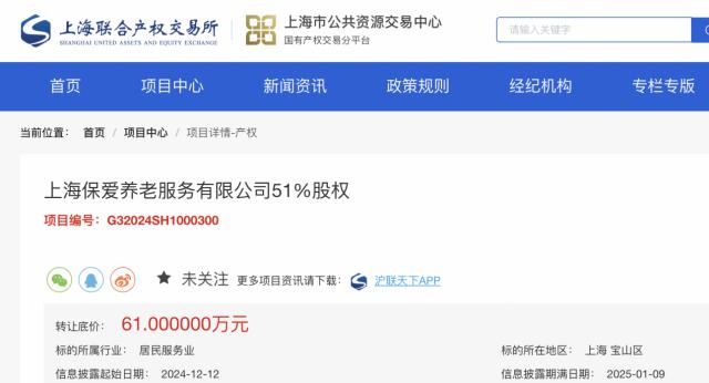 乐居财经 刘治颖 12 月 12 日,上海保利城市发展有限公司挂牌转让上海保爱养老服务有限公司 51% 股份,转让底价为 61 信息公开到期日为万元。 2025-01-09。