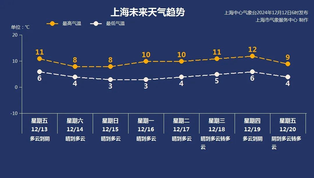 14日至18日,申城将继续天气晴朗寒冷。20天左右,会有一股冷空气影响上海。一波又一波的冷空气会导致上海的天气在12月中旬比常年同期更冷。据估计,徐家汇站的平均温度可能更低。~2℃,防冻保暖不能放松。在持续晴冷干燥的天气里,也要注意用火用电用气的安全。在冷空气影响前后,还要注意防止强风的影响。