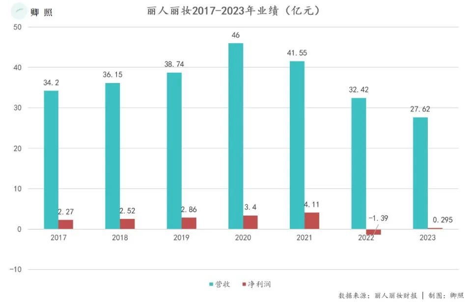 在刚刚上市的2020年,丽人丽妆的收入达到了46亿元的巅峰,但此后,受淘宝流量红利见顶和直播电商兴起的影响,业绩开始扭头,并持续了三年。到2022年,损失将达到1.39亿元,到2023年,利润将会有所改善,但净利润也只有2950万元,不到2020年净利润的十分之一。