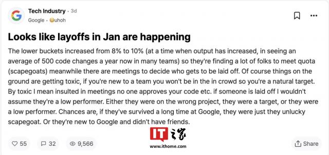 IT 世家 12 月 12 每日消息,根据职场匿名论坛 Team Blind 谷歌员工担心公司将于明年发布最新热议帖子。 1 每月开始新一轮裁员。