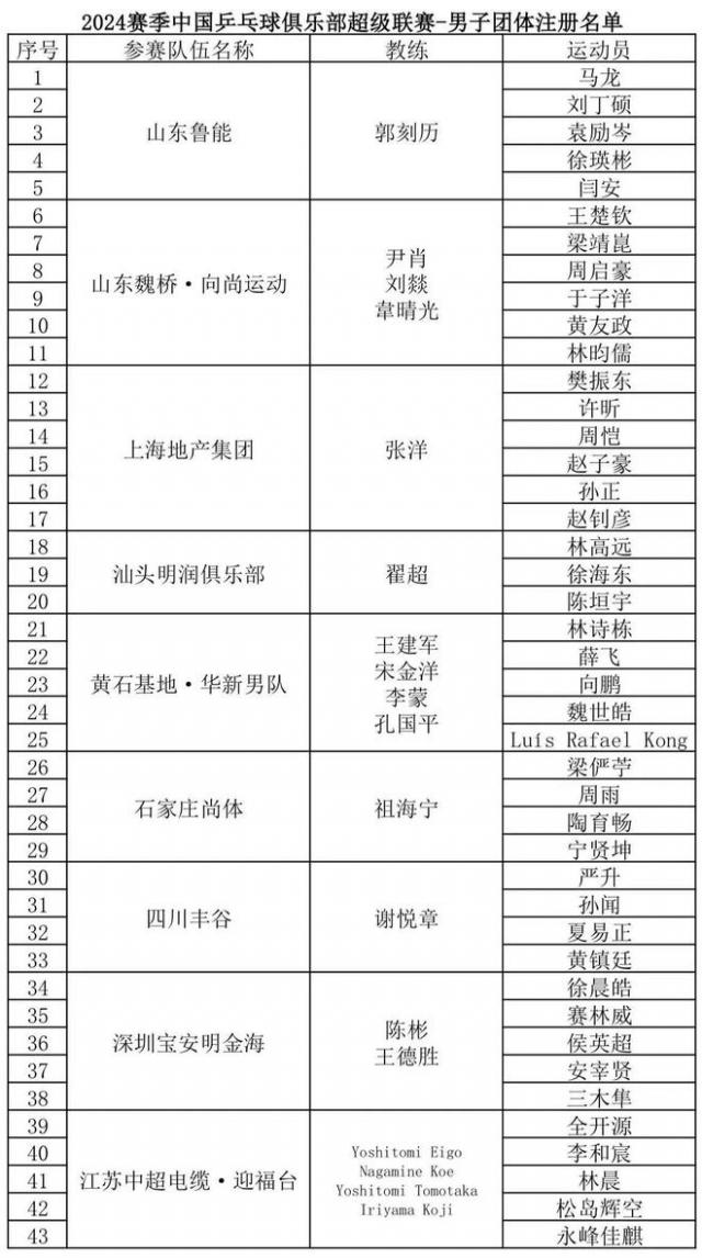 在已经公布的注册名单中,男团卫冕冠军山东鲁能队基本延续了上一届阵容,其中注册名单为:马龙、刘丁硕、袁励岑、徐瑛彬和闫安。但是马龙现在去挪威参加老瓦杯,将缺席这个阶段的乒超比赛。