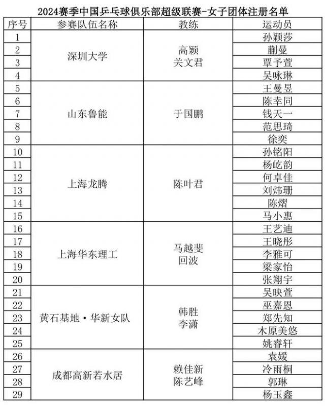 至于女性,去年深圳大学队冠军的核心球员之一陈梦,虽然没有出现在注册名单上,但他们仍然是冠军中最有利的竞争对手之一,包括孙颖莎、邈曼、予萱和中国香港球员吴咏琳。去年,亚军山东鲁能队在保留王曼昱、陈幸同、钱天一和范思琦原有团队的基础上,增加了年轻球员徐奕。