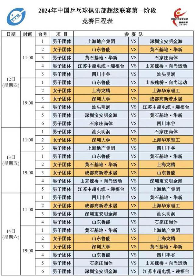 第一阶段前三天的赛程已经明确表示。其中今天早上 11 点,樊振东、许昕所在的上海房地产集团、王楚钦、山东魏桥、王曼昱、钱天一、陈幸同所在的山东鲁能女队都将上场。