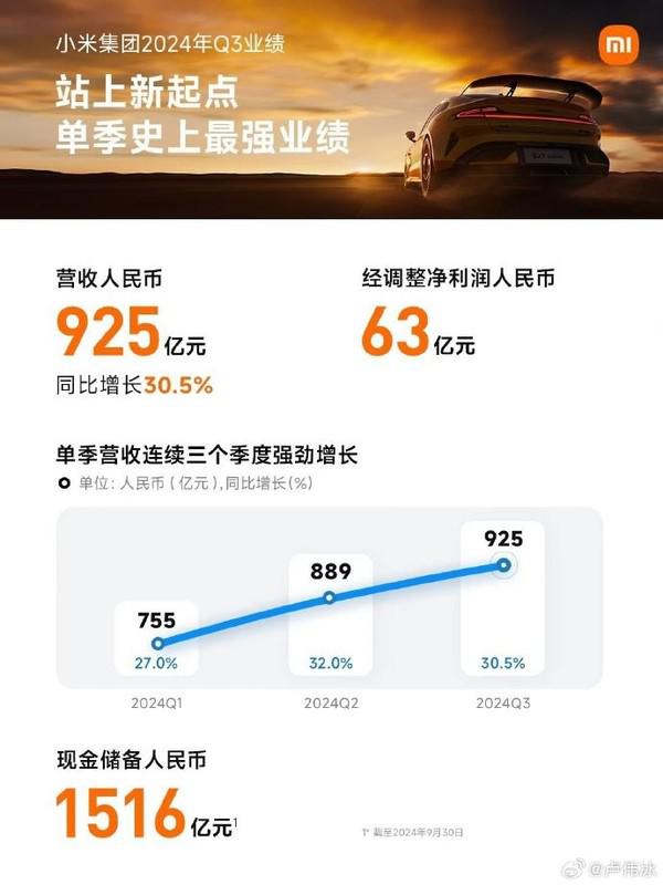 官方财务报告显示,2024 年度第三季度,小米公司总收入为 925 亿元人民币,同比增长。 单季度营收连续三个季度实现强劲增长,净利润人民币调整为30.5%, 63 十亿美元。另外,截至 2024 年 9 月 30 日本,小米公司的现金储备是 1517 亿元。