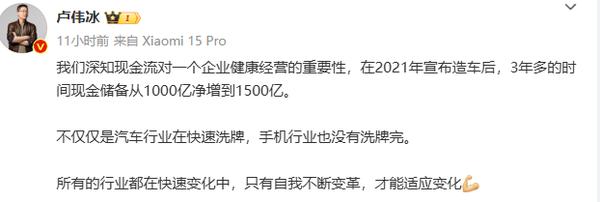 【CNMO 科技消息】12 月 11 日晚,小米集团合伙人、总裁、手机部总裁、小米品牌总经理发文称:“我们知道现金流对于一个企业健康管理的重要性, 2021 2008年宣布造车后,3 多年来,时间现金储备从 1000 亿增加到 1500 亿。不只是汽车行业正在迅速洗牌,手机行业也没有完成洗牌。一切行业都在不断变化,只有自我不断变化,才能适应变化。"