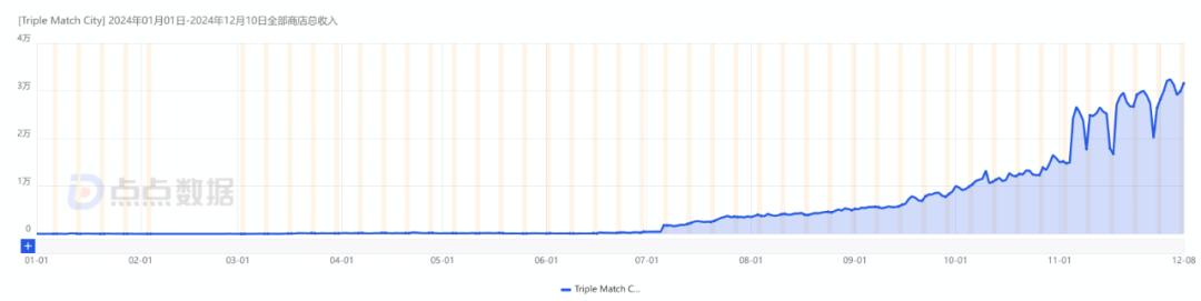 《Triple Match City》现在全球大部分市场都已经上线了,游戏今年7月开始发力,进入11月以来收益有了飞跃性的增长。根据小数据估计,《Triple Match City》目前双端全球预计收入已超过176万美元,12月初单日最高收入出现,超过3.2万美元,游戏收入走势一路改善。