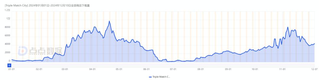 点点数据显示,《Triple Match City》上半年迎来了一波下载高峰,但这些安装量并没有转化为利润。经过不断的商品优化和购买规模的扩大,游戏从11月份开始再次获得更集中的下载量爆发。目前游戏总下载量已经超过100万次。