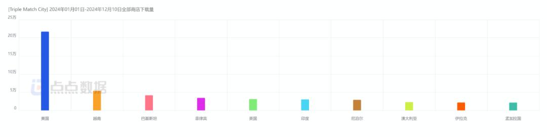 美国依旧是《Triple Match City》占下载量最大的市场,占19.93%。越南(4.96%)巴基斯坦(3.82%)菲律宾(3.16%)排名第二至第四,这款游戏在新兴市场的下载条件也相当不错。