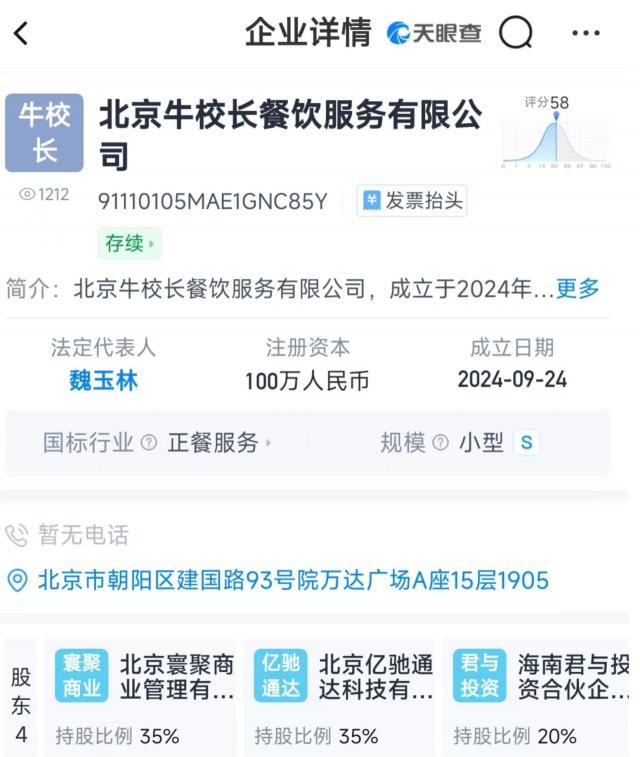 牛校长品牌属于北京牛校长餐饮经营有限公司,注册时间为 2024 年 9 月 24 日本。王思聪的普思资本通过间接对外投资获得了该公司的超级投资 3.5% 股票。抖音账号“王校长牛排(牛校长版)”发布了一些关于牛校长的短片,其简介还显示,牛校长品牌的创始人是王思聪。