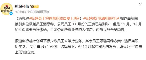 据了解,目前极越汽车计划只保留少数员工维持业务运营,而其他员工则面临两种选择:一种是选择辞职,明年辞职。 2 月底可获得 N 1 经济补偿;第二,选择留下来,但是自己 12 从月份开始就拿不到工资,相当于“自付工作”。这个方案让员工感到无助和不安。