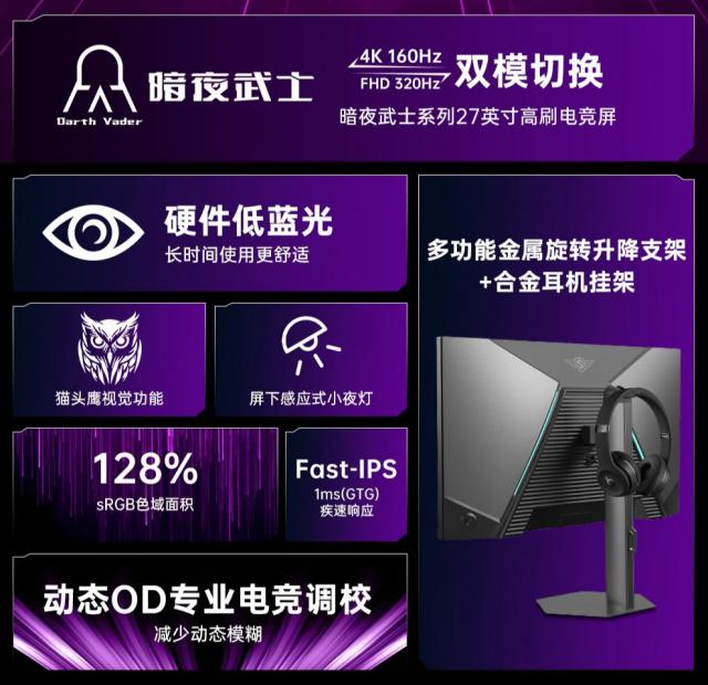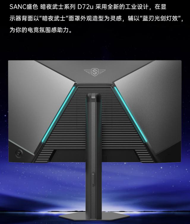 根据介绍,盛色 27 英尺暗夜战士 D72u 屏幕背面采用“暗夜骑士”面罩设计,辅以“蓝刃光剑”灯光效果。显示器亮度 400nit、分辨率 3840*2160,支持 320Hz 高刷(高刷需要切换为 FHD 分辨率)。