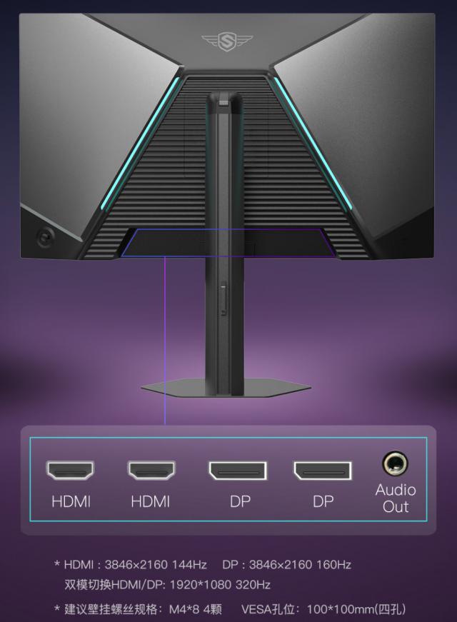 提供这个显示屏 2 个 HDMI 接口、2 个 DP 接口、1 个 Audio Out 接口,其中仅 DP 接口支持 3846 × 2160 / 160Hz 画面显示、HDMI 和 DP 接口均支持 1920 × 1080 / 320Hz 画面显示。