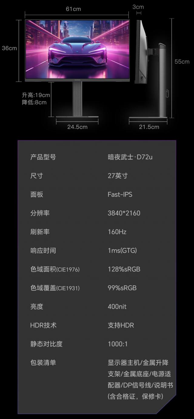 盛色 27 英尺暗夜战士 D72u 发布显示屏,首发 1599 元