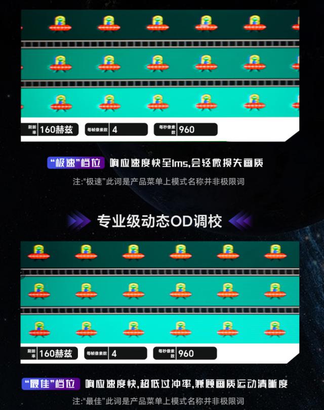 这个显示屏支持猫头鹰的视觉功能。打开后,屏幕中间会出现一个焦点框,适合黑暗区域的动画场景;显示屏也通过动态 OD 调试,响应速度 1ms,根据当前帧率自动匹配支持 OD 加快策略。