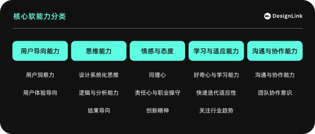 互联网产品设计师需要具备一系列应对复杂设计情境和团队合作需求的核心软能力。这些能力可以分为五类:用户导向能力、思维能力、情绪和态度、学习和适应能力、沟通和合作能力。