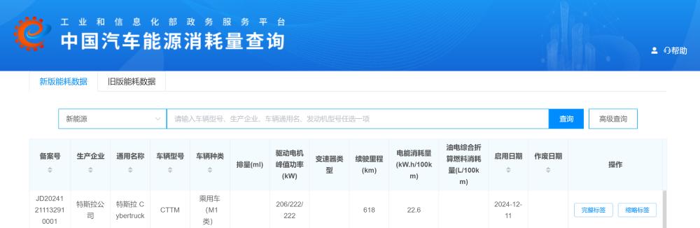 根据网站上显示的数据,特斯拉Cybertruck的车辆类型为乘用车(M1类),永磁电机峰值功率为206(约276马力)/222(约297马力)/22kW,续航里程为618km(应为CLTC标准),功耗为22.6。kWh2024年12月11日,/100km,启用日期。
