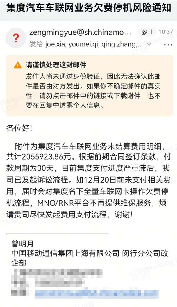 今日,一封内部邮件流出,邮件内容表示:配件为2055923.86元的集度汽车联网业务未结算费用明细。