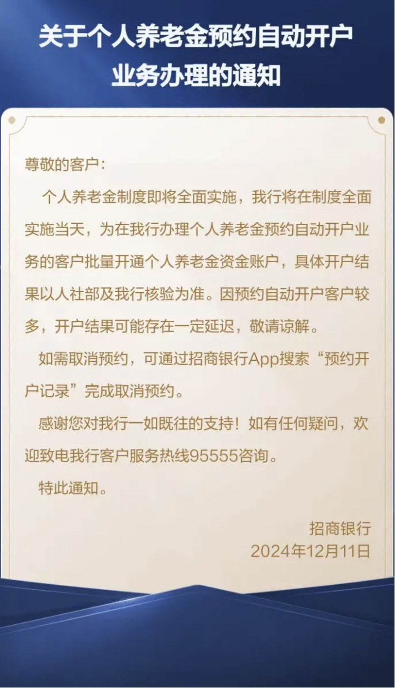 记者发现,近日,多家银行机构策划了个人养老金制度的“全面开放”。招商银行APP在12月11日发布的《关于办理个人养老金预约自动开户业务的通知》中提到:“个人养老金制度将全面实施,我行将在系统全面实施当天,为在我行办理个人养老金预约自动开户业务的用户批量开立个人养老金账户。”