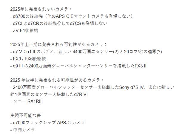 第一,基本确定不会在 2025 每年发布的照相机,包括索尼 α 6700 迭代产品,其它选择 E 卡口的 APS-C 也不会有画幅相机 2025 年度发布。与此同时,索尼 α 7 CII 和 α 7 CR 迭代型号,α 7 CS、ZV-E1 没有一个迭代型号会存在 2025 年发布。