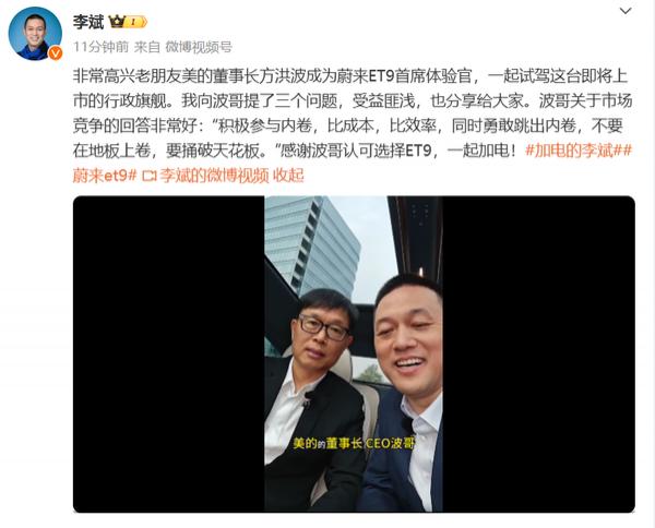 李斌说:“很高兴老友美董事长方洪波成为蔚来。 ET9 首席体验官,试驾这款即将上市的行政旗舰。我给波哥提了三个问题,受益匪浅,分享给大家。波哥对市场竞争的回答很好:‘积极参与内卷,比较成本和效率,勇敢地跳出内卷,不卷在地板上,戳破天花板。’感谢波哥的认可和选择。 ET9,一起通电!"