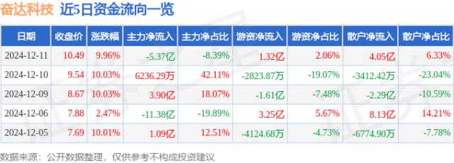 12 月 11 在日资金流入数据方面,主要资金净流出 5.37 约1约1约1亿元,约占成交额 游资资金净流入8.39% 1.32 约1约1约1亿元,约占成交额 散户资金净流入2.06% 4.05 约1约1约1亿元,约占成交额 6.33%。