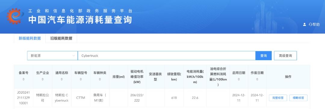 十二月十一日,工信部中国汽车能耗查询系统增加, Cybertruck特斯拉电动皮卡能源消耗申报信息,很多网友一夜之间烧开。
