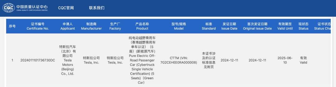根据认证信息,这次是通过的。 单车认证该方法引入了Cybertruck,该车架号为7G2CEHEE0RA000008,而非大规模引入。