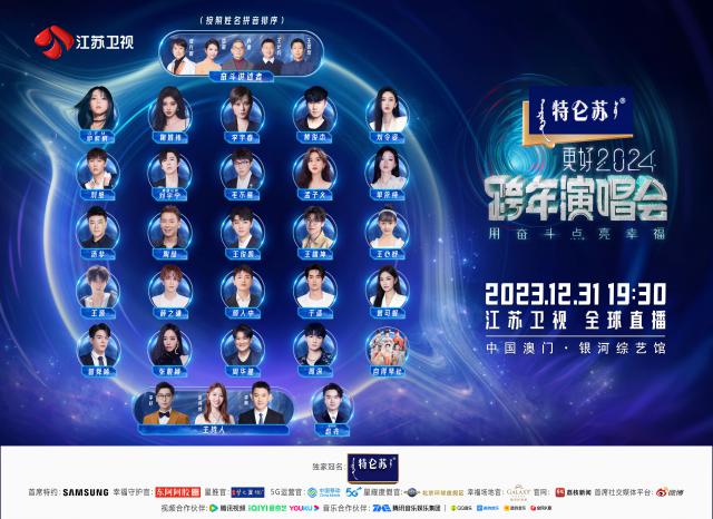 2024 每年的步伐越来越近,特仑苏更好。 2024 江苏卫视跨年演唱会即将举行 12 月 31 日 19:30 盛大的中国澳门银河综艺馆演唱。最近,整个阵容的海报发布:G.E.M. 邓紫棋、鞠婧祎、李宇春、林俊杰、刘令姿、刘维、刘宇宁、毛不易、孟子义、单纯、汤非、陶喆、王俊凯、王啸坤、王心坤、王源、薛之谦、颜人中、于适、曾可妮、曾舜曦、张靓颖、周华健、周深、自得琴社、赵兆等。更多的方圆、屈萌、苏童、王计兵、王昱珩,作为奋斗的叙述者代表,围绕“什么是幸福”分享奋斗故事,深情表达奋斗的野心、创造的力量和发展的果实,与广大观众共同走向更好。 2024。