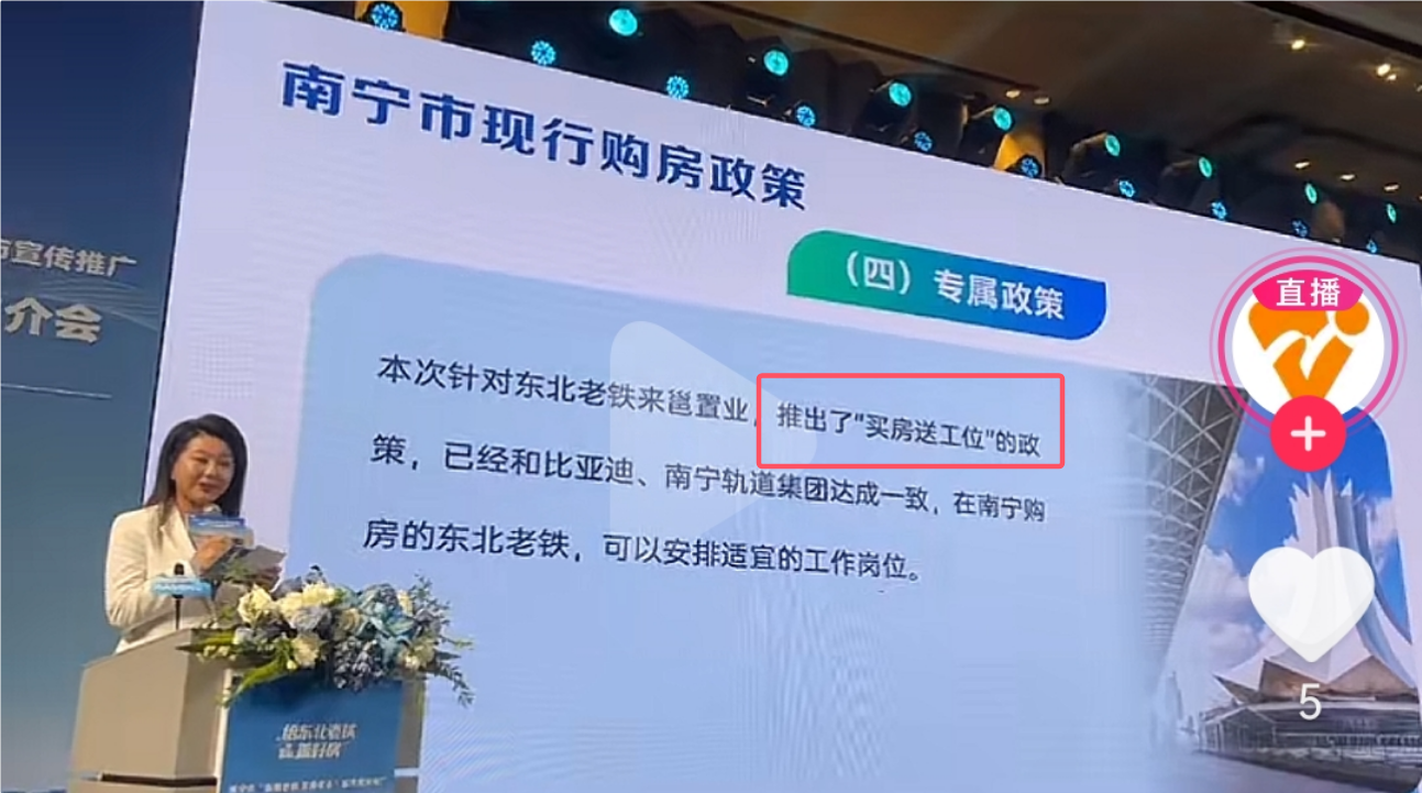 “这一次,东北老铁来买房推出了“买房送工序”的政策,与比亚迪、南宁轨道集团达成协议。在南宁买房的东北老铁可以安排合适的岗位。”