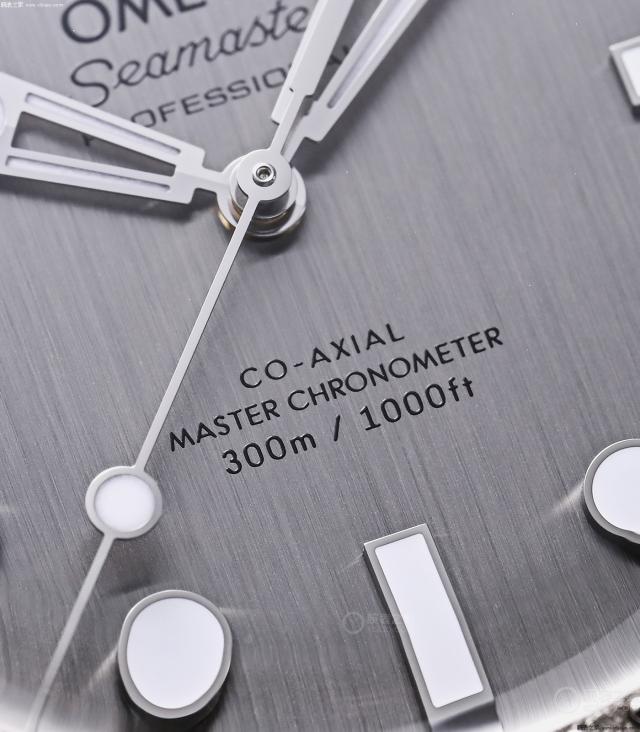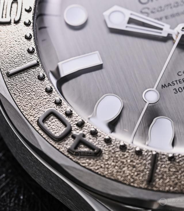 海马 300 大米“无历”灰盘,在去掉日历窗口的同时,盘面全部拉丝。垂直拉丝,覆盖整个盘面。熟悉欧米茄的玩家都知道,目前表盘的“波浪形”是 8800 这一代海马 300 大米的标志性特征,90%以上在售海马。 300 大米都是“波浪形”,但没有使用“波浪形”的海马很小一部分。 300 大米,都是非常特殊的存在,包括这个“无历”灰盘。这是垂直拉丝盘面的独特部分。