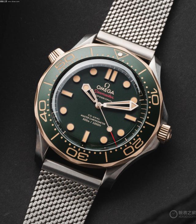 新款“无历”欧米茄海马 300 大米,钛壳黄铜金绿盘。