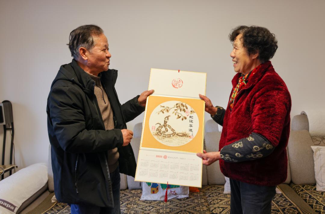 居民费杏珍说:“明年就是蛇年了,收到这样的挂历,我感到非常高兴,也非常高兴,第一时间就把它挂了起来。”