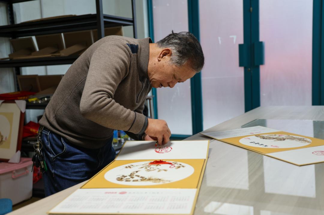 随着新年的临近,焦永兴为亲朋好友和社区老人创作了80多幅生动形式各异的蛇年烙铁画日历。完成这样的作品至少需要4~5个小时。为了更好地呈现“蛇”的形象,焦永兴精心处理了每一幅烙铁画。