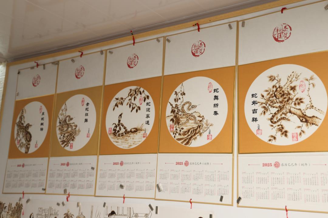 焦永兴说:“今年,我画了各种各样的‘蛇’。有十几种不同的蛇爬树,在山上,在地上。一般日历都是有颜色的,这种烫印时间长了也不会褪色。考虑到家家户户都有挂日历的习惯,我会用自己的特长给他们做烙铁画日历。”