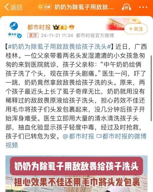 前不久,#奶奶用敌敌畏给孩子洗头除虱#引起轻度中毒的消息在微博热搜。在下面的留言区,很多网友表示害怕,因为小时候父母缺乏相关的知识和意识,对自己做了同样的事情。